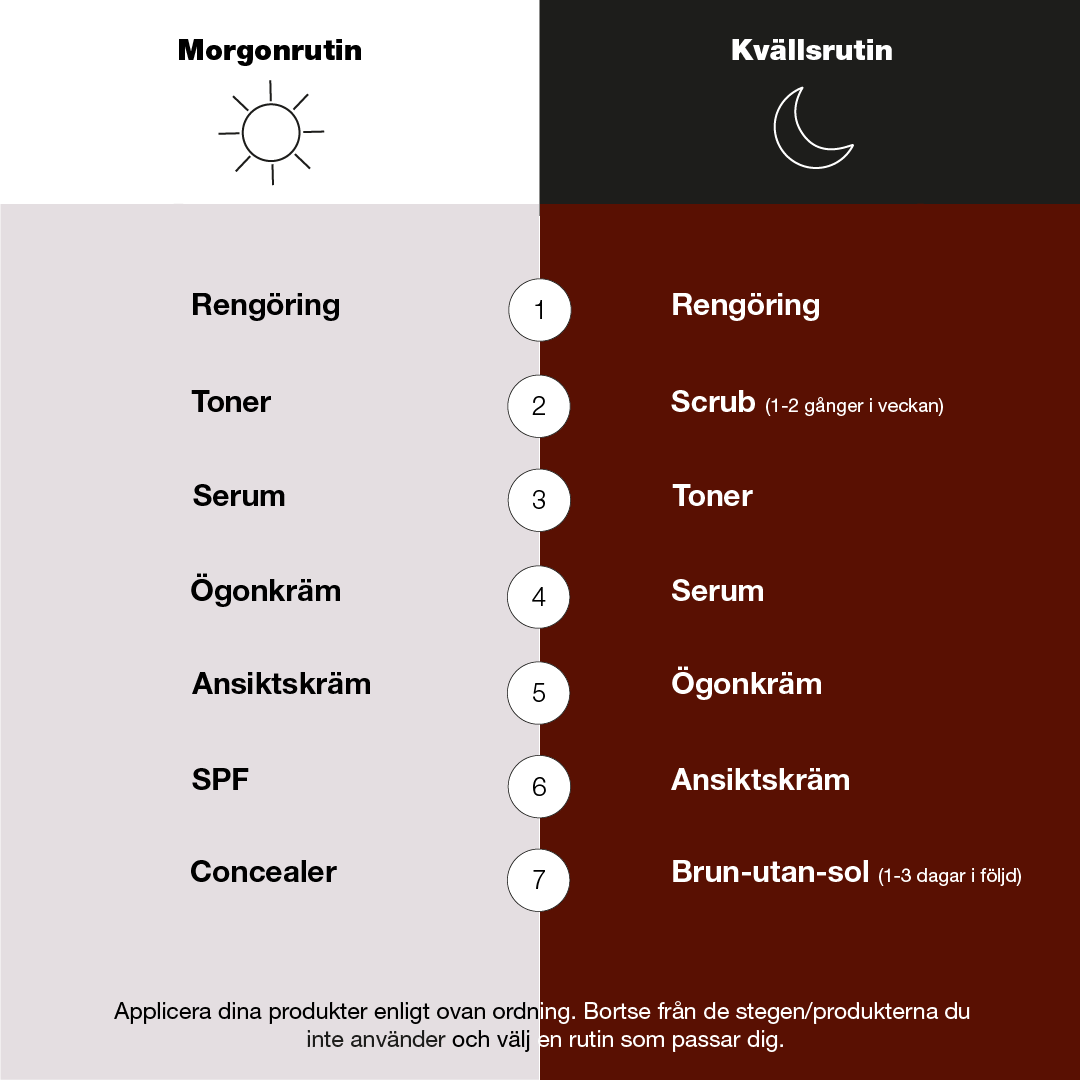 Applicera produkterna i följande ordning 1-2 gånger per dag, gärna morgon och/eller kväll.