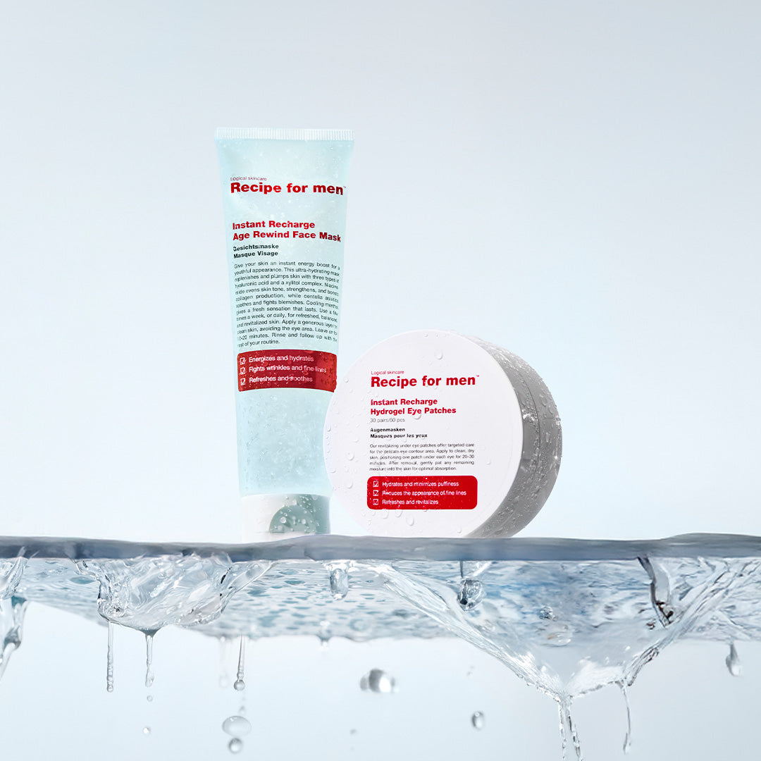 Instant Recharge Age Rewind Face Mask ger intensiv fukt som minimerar rynkor, lugnar stärker och ger lyster. Samtidigt som Hydrogel Eye Patches ger ögonområdet en piggare look genom att minska svullnad, mörka ringar och torra linjer. Båda ger direkteffekt efter 20 min - använd ihop eller var för sig.